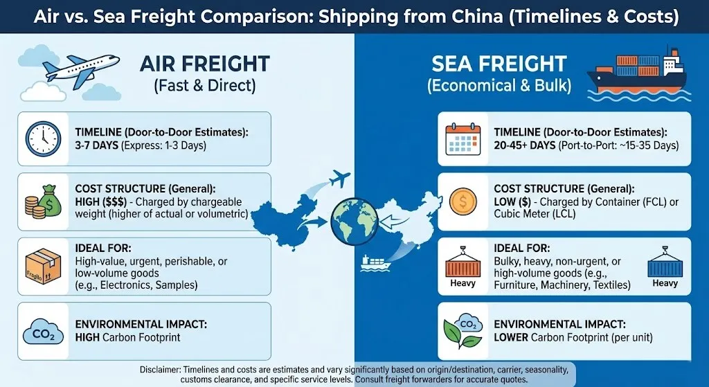 (উপরে: চীন থেকে শিপিংয়ের জন্য এয়ার বনাম সমুদ্র মালবাহী তুলনা ইনফোগ্রাফিক, টাইমলাইন এবং খরচ হাইলাইট)